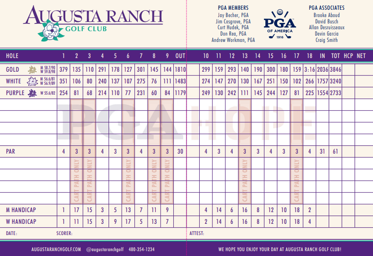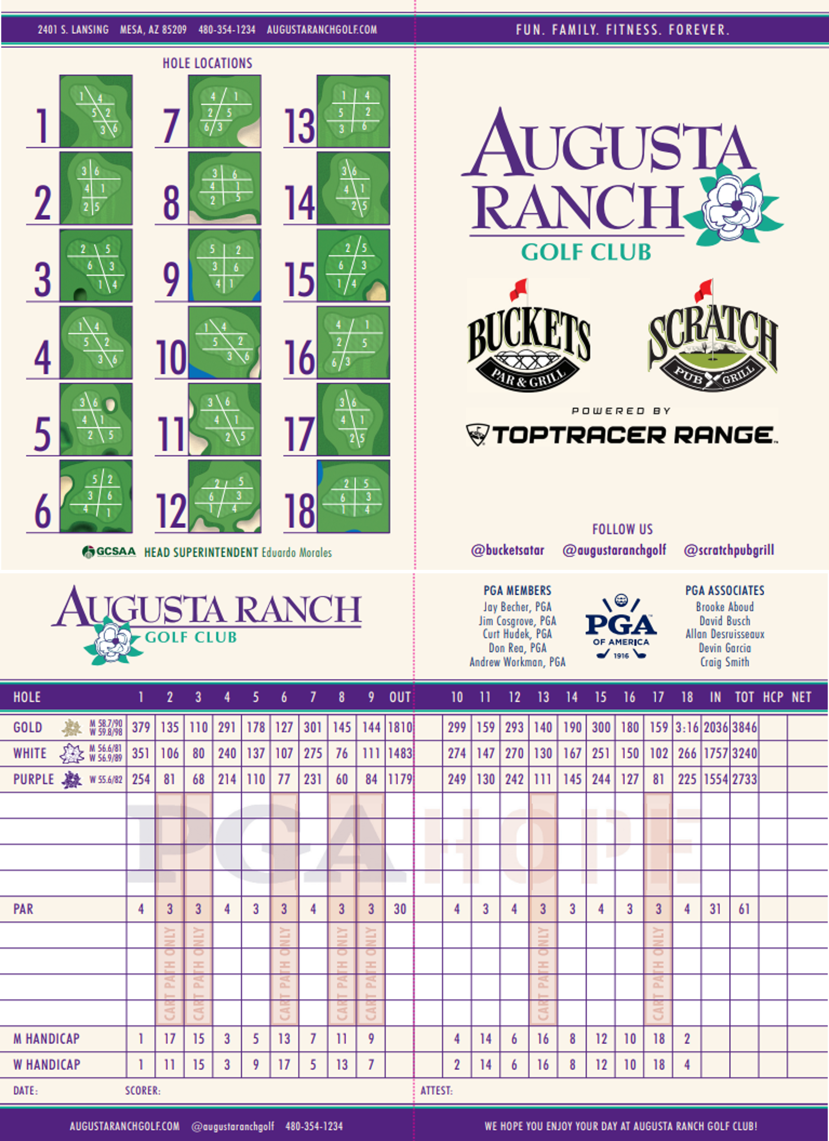 Augusta Ranch Golf Club is the ideal facility for players new to the game, golfers wanting to sharpen their short game skills and golfers looking to lower their scores. And in an era of limited free time, one can walk or ride and play 18 holes of golf in 3 ½ hours or less.